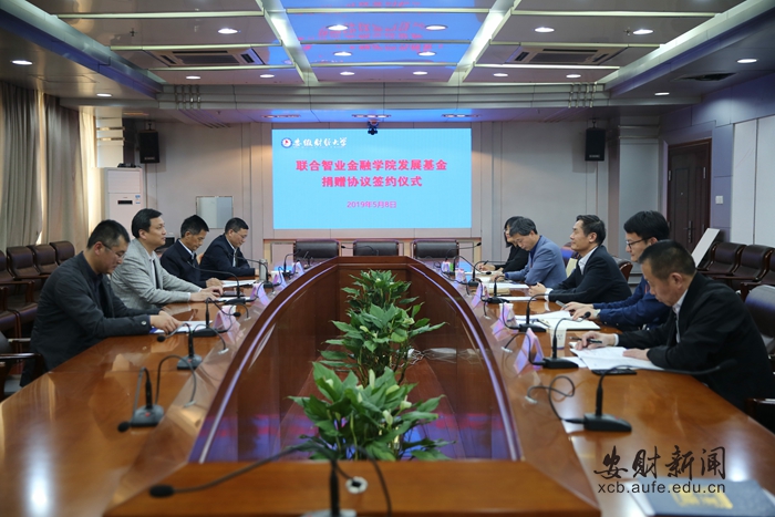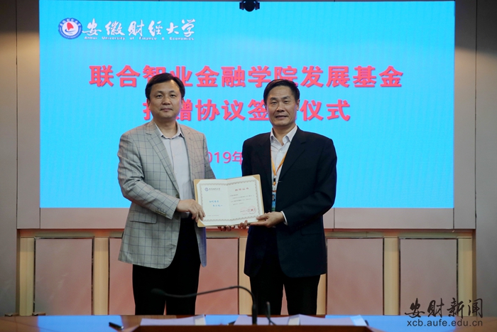 捐赠仪式上,北京联合置业集团、安徽财经大学教育基金会、安徽财经大学三方代表进行了现场签约。北京联合置业集团向学校捐赠一百万元,在金融学院设立“联合智业金融学院发展基金”。陈元生代表北京校友会向学校校友总会赠送了“龙石”校庆礼品。